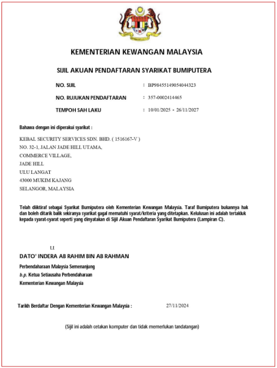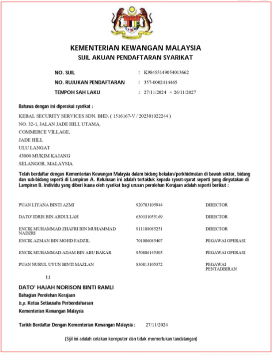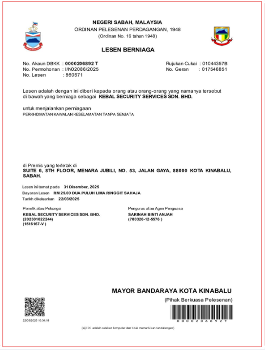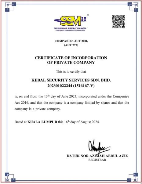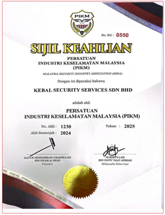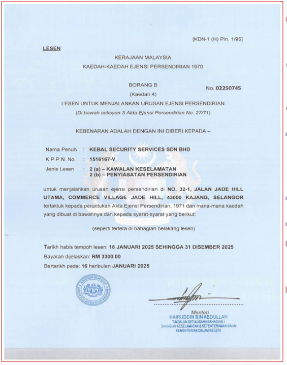 Kebal Security Services is a fully licensed security provider under the Private Agency Act 1971, approved by the Ministry of Home Affairs (KDN).